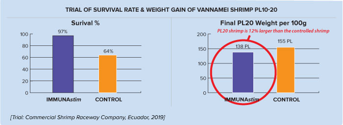 The use of IMMUNAstim dramatically improves the survival rate and weight of PL20 shrimp.